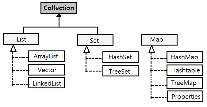 여기서는 Java Util의 Collection 인터페이스를 List와 Set이 상속받고 있으며, 점선은 인터페이스를 구현한 하위클래스 관계(위에꺼로 부터 상속받는 하위클래스)이다. Map은 맵으로 부터 구현된 하위클래스란 뜻.